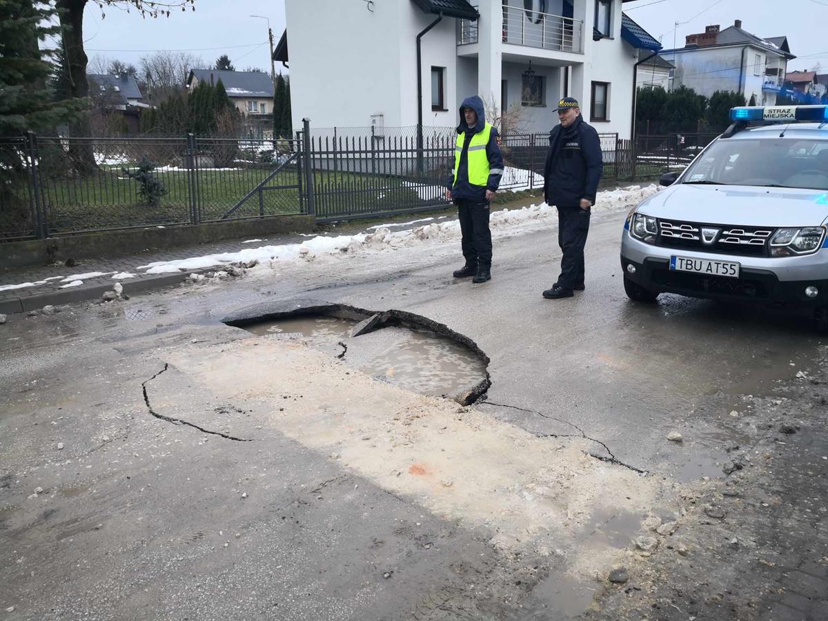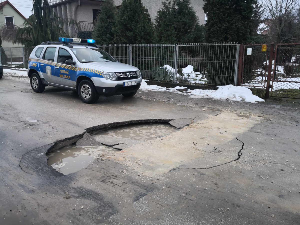 Funkcjonariusze Straży Miejskiej zabezpieczyli teren i proszą uprzejmie kierowców o omijanie tego miejsca do czasu usunięcia awarii.