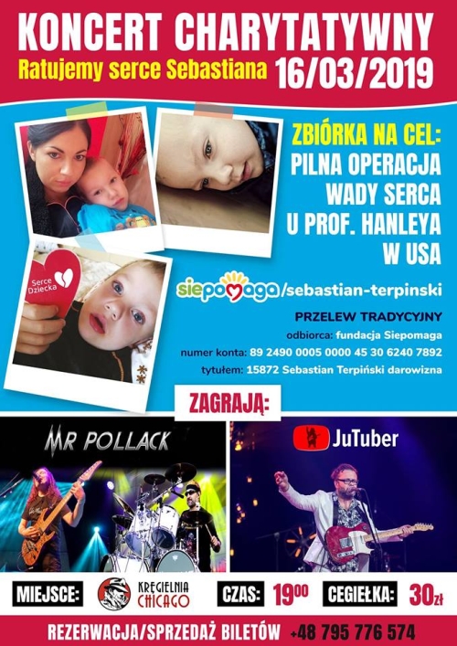 Dziś, sobotę, 16 marca 2019r. o godzinie 19.00 zapraszamy na koncert charytatywny „Ratujemy Serce Sebastiana” do Kręgielni Chicago w Busku-Zdroju. Sebastian Terpiński 4-letni chłopczyk z Buska-Zdroju pilnie potrzebuje ratującej życie operacji serca w USA!