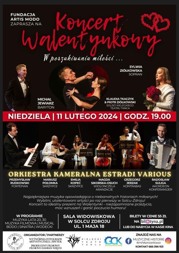 Koncert Walentynkowy pt. ,,W poszukiwaniu miłości…” już 11 lutego 2024 o godz. 19.00 w Sali Widowiskowej w Solcu-Zdroju! Najpiękniejsza muzyka opowiadająca o niebanalnych historiach miłosnych! Wybitni, utalentowani artyści po raz pierwszy w Solcu-Zdroju! – informuje 15.01.2024 e-strona Gminnego Centrum Kultury w nieodległym od słonecznego miasta ze złotą monstrancją w herbie Solcu-Zdroju.