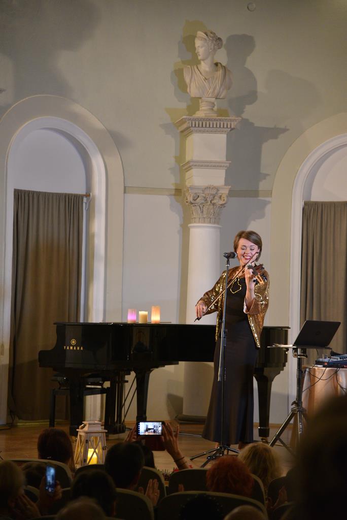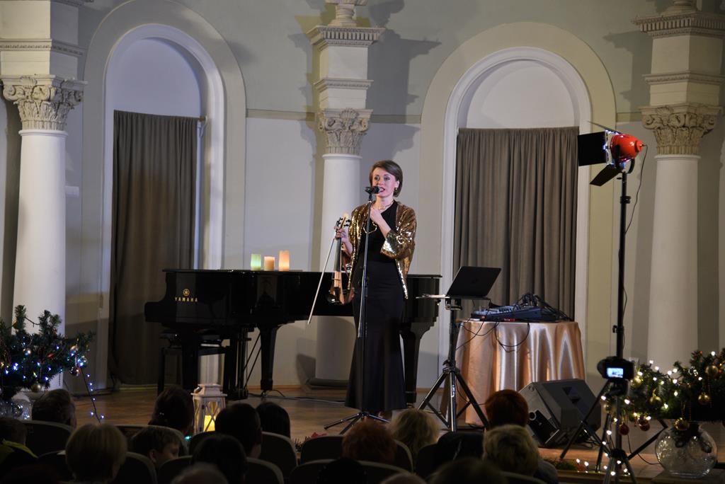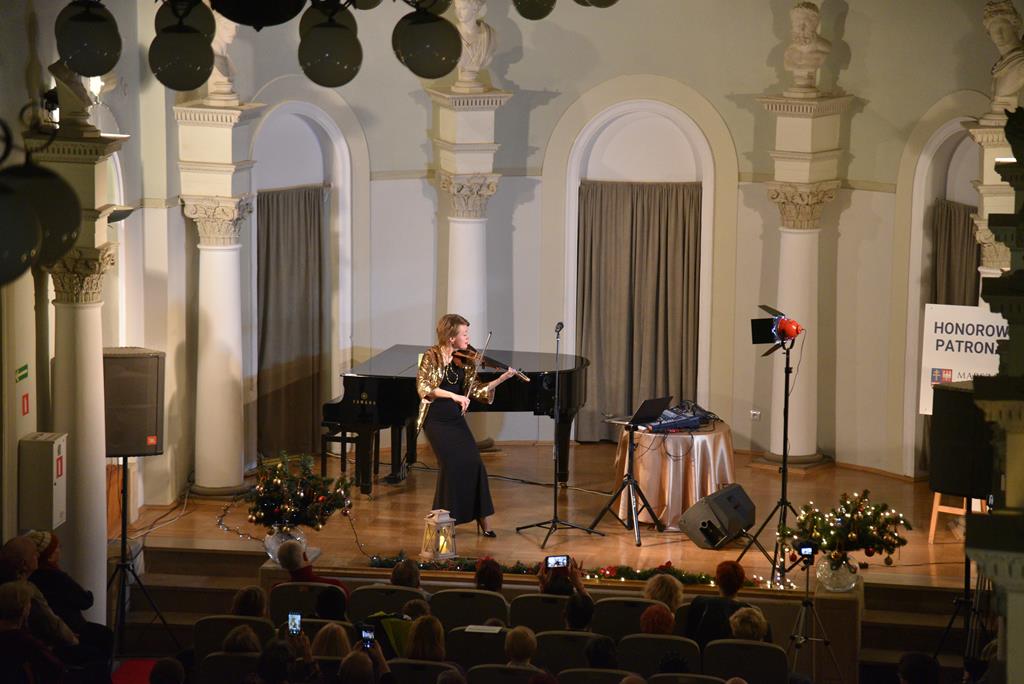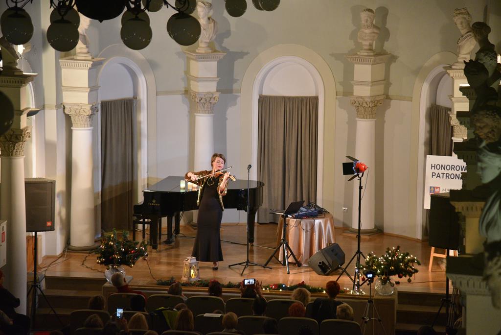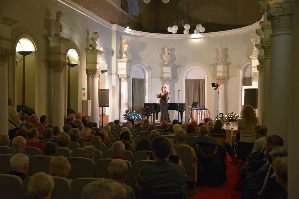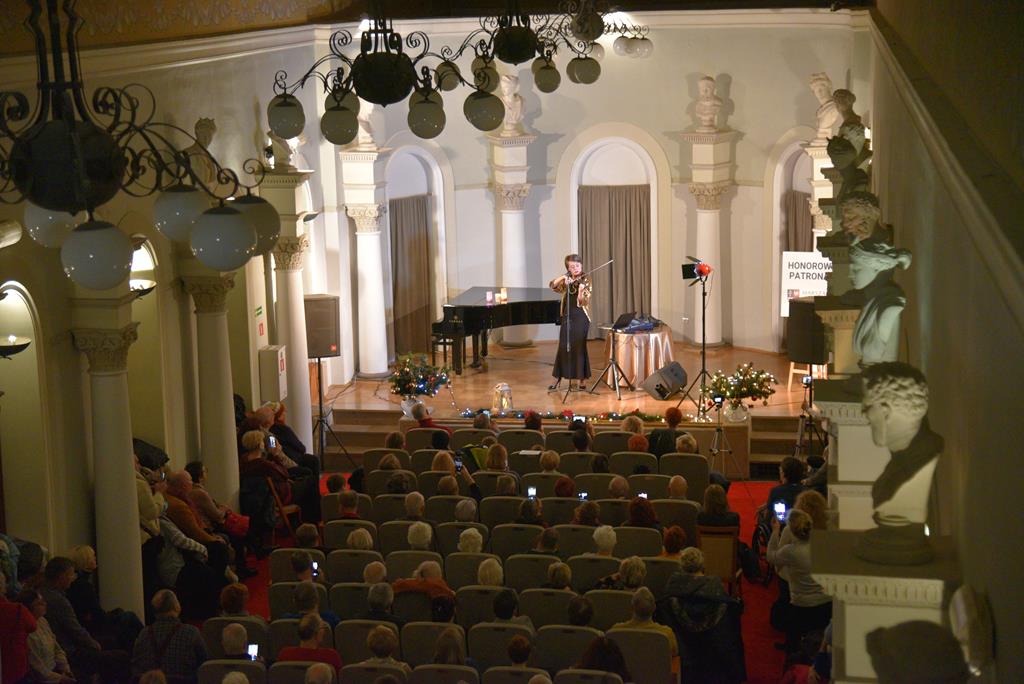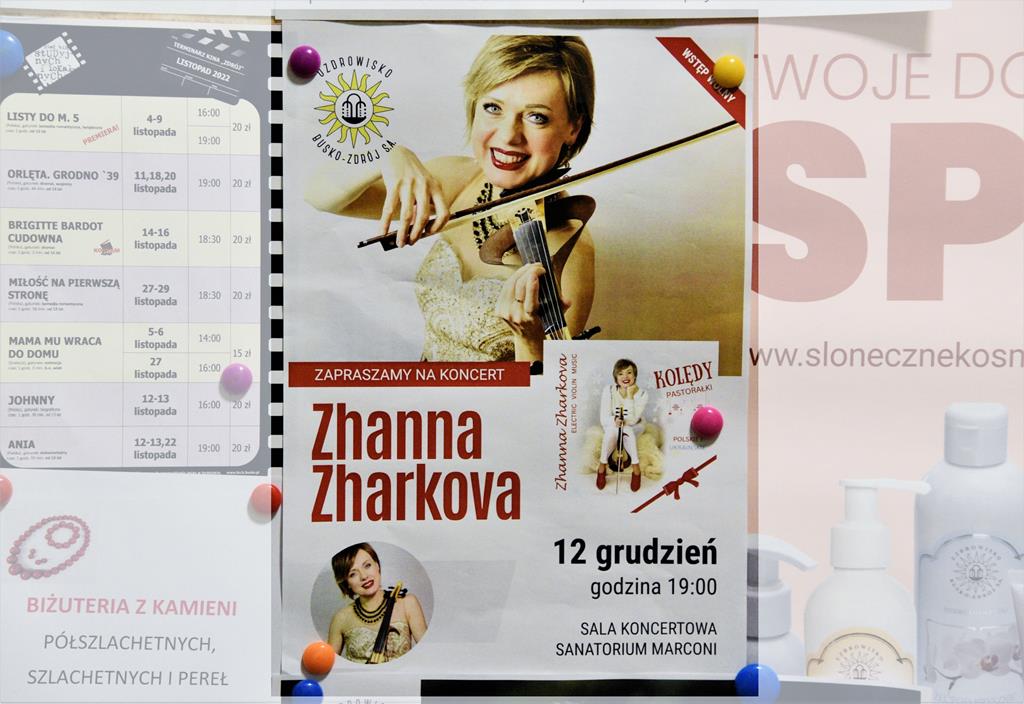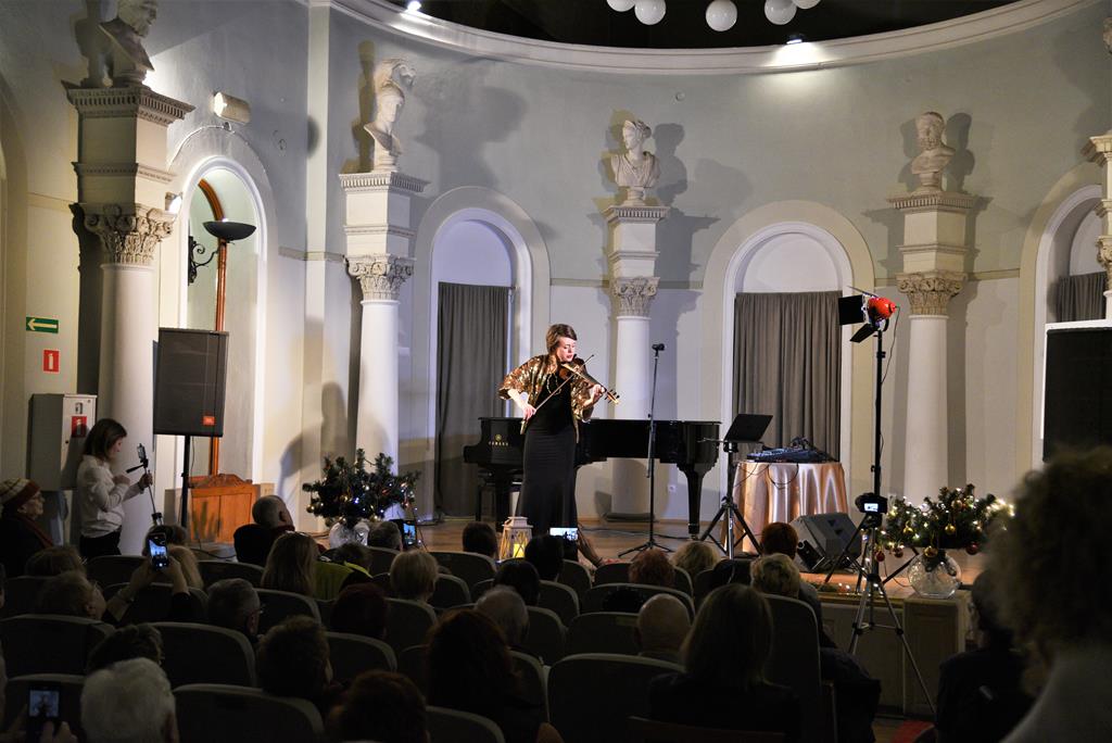 Grudniowy koncert w kameralnej sali koncertowej najstarszego buskiego sanatorium rozpoczął się o godzinie 19:00. By podziwiać utrzymany w świątecznych klimatach występ utalentowanej skrzypaczki zza naszej wschodniej granicy do Marconiego przybyło bardzo dużo osób. Zajęte były dosłownie wszystkie miejsca na widowni oraz na balkonie, sporo widzów siedziało na „dostawkach”. Ostatni, dla których zabrakło miejsc siedzących, oglądali ponad godzinny muzyczno-wokalny popis Pani Żanny na stojąco.