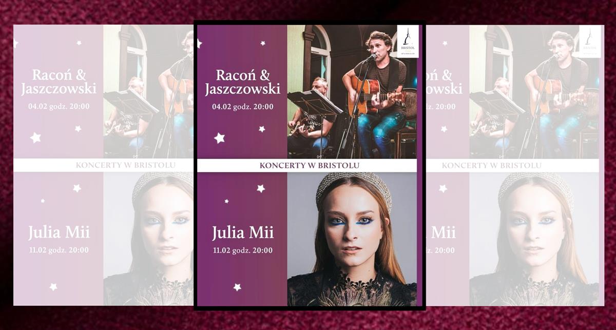 Nowy miesiąc to nowe koncerty! Kto zagości na scenie Bristolu w najbliższych tygodniach? Już w sobotę 4 lutego usłyszymy przeboje muzyki rockowej i nie tylko w wykonaniu wspaniałego duetu gitarowego: Racoń i Jaszczowski. Zaś w następny weekend, 11 lutego, w muzyczną podróż zabierze krakowska wokalistka, autorka tekstów i kompozytorka Julia Mii!