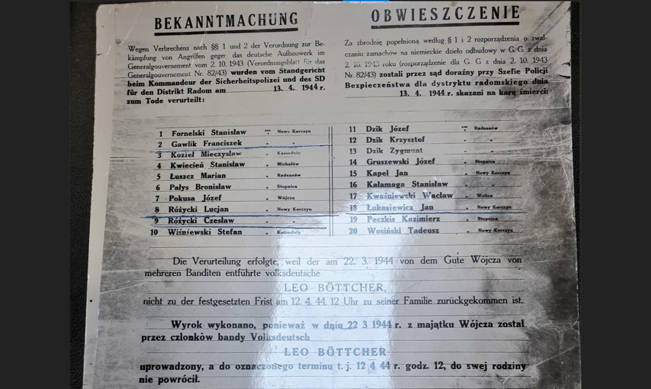 Kluczowe w przypadku dalszych losów aresztowanych żołnierzy Podobwodu AK Nowy Korczyn są dwa obwieszczenia niemieckie (Bekanntmachung) z 24 marca 1944 r. oraz z 13 kwietnia 1944 r. Pierwsze z nich informowało, że wyrokiem Sądu Doraźnego 30 osób skazano na karę śmierci. Jak argumentowano: