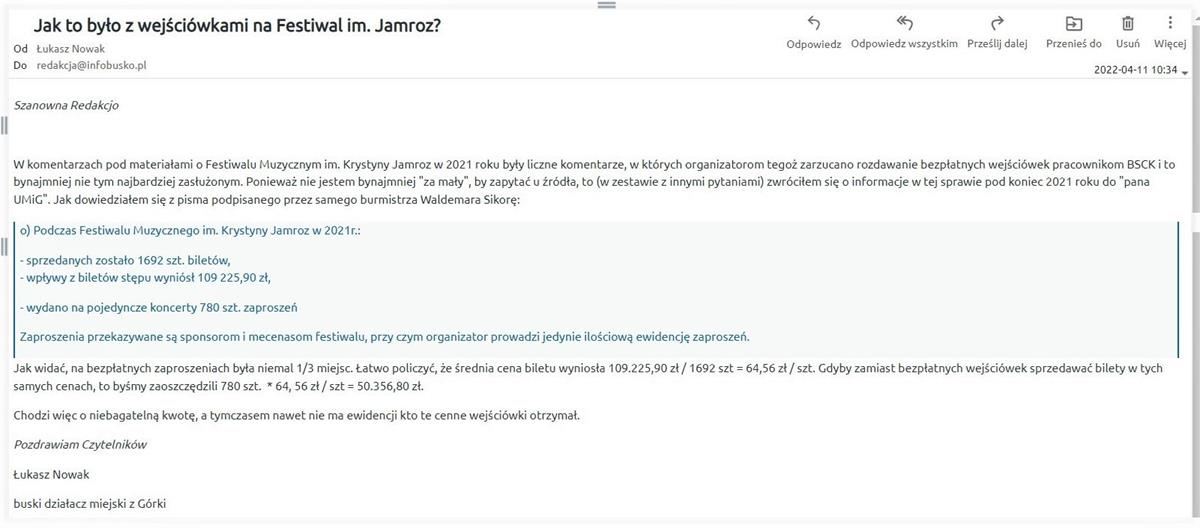 Szanowna Redakcjo, W komentarzach pod materiałami o Festiwalu Muzycznym im. Krystyny Jamroz w 2021 roku były liczne komentarze, w których organizatorom tegoż zarzucano rozdawanie bezpłatnych wejściówek pracownikom BSCK i to bynajmniej nie tym najbardziej zasłużonym. Ponieważ nie jestem bynajmniej „za mały”, by zapytać u źródła, to (w zestawie z innymi pytaniami) zwróciłem się o informacje w tej sprawie pod koniec 2021 roku do „pana UMiG”. – pisze 11.04.2022 na wstępie e-korespondencji do Redakcji infoBusko.pl pan Łukasz Nowak