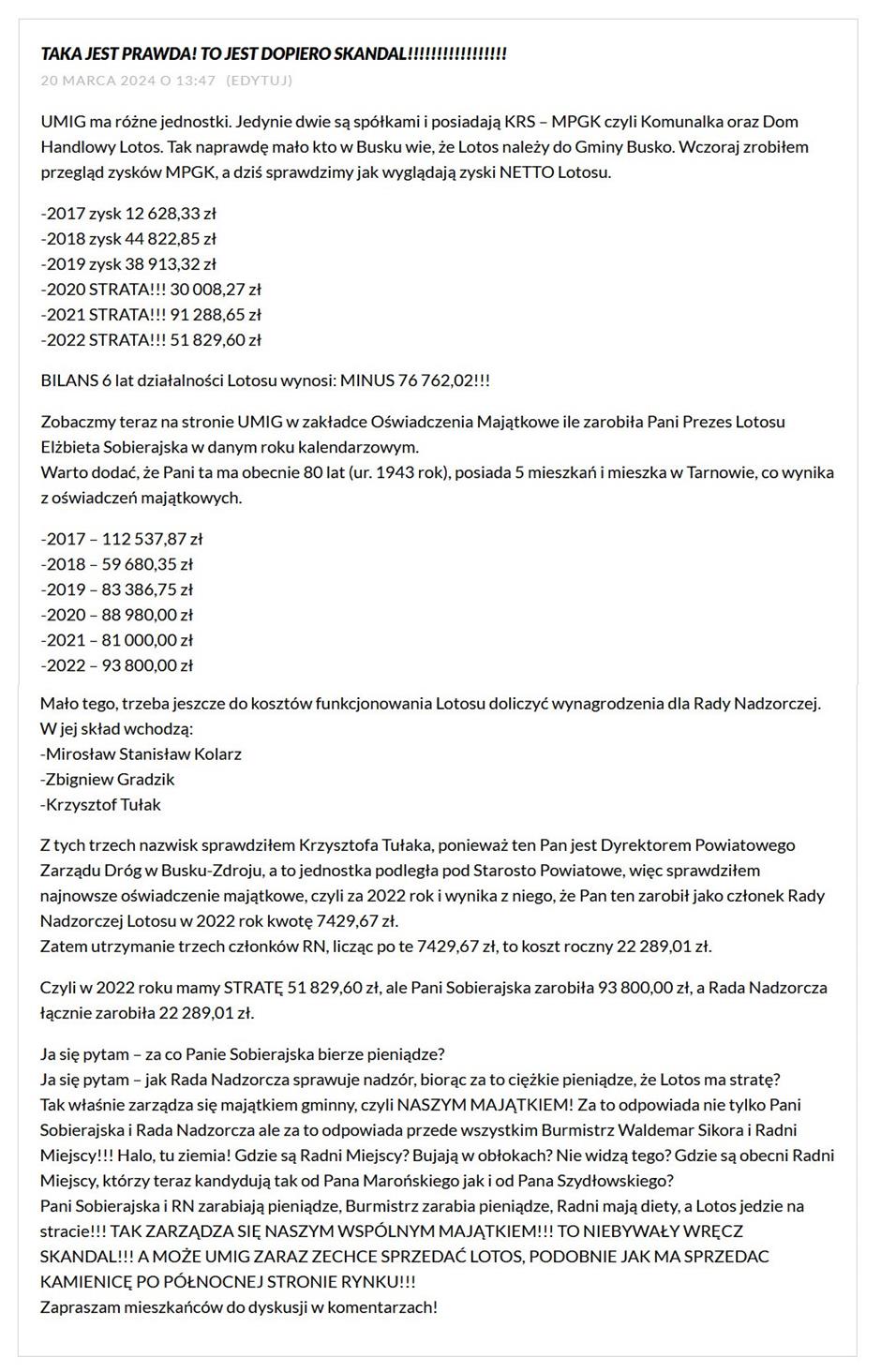 „UMIG ma różne jednostki. Tak naprawdę mało kto w Busku wie, że Lotos należy do Gminy Busko. Dziś sprawdzimy jak wyglądają zyski NETTO Lotosu.