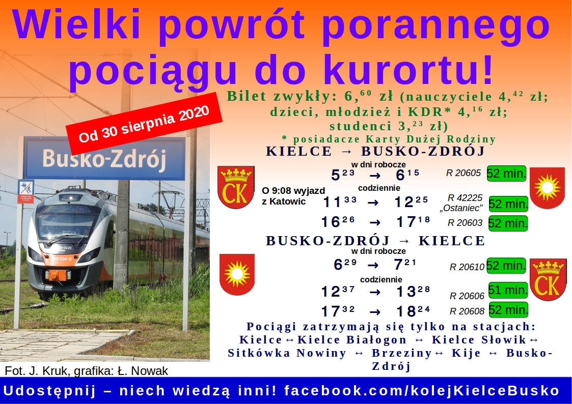 Mam przyjemność poinformować Buszczanki oraz Buszczan za pośrednictwem portalu InfoBusko, iż od poniedziałku 31 sierpnia 2020 roku do pociągów relacji Kielce – Busko-Zdrój – Kielce dołączy dodatkowa, poranna para w dni robocze odjeżdżająca z Kielc o 523 i wyruszająca z Buska o 629 . O takie poranne połączenie zabiegałem w UMWŚ od kilku lat. – informuje w mailu do redakcji pan Łukasz Nowak