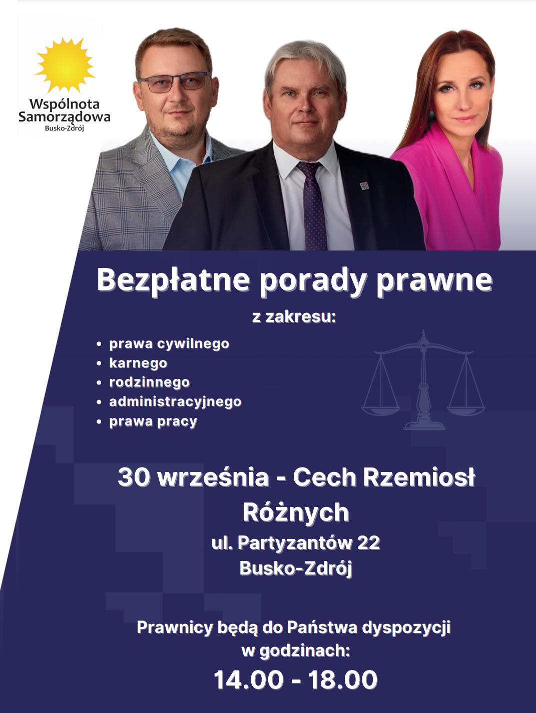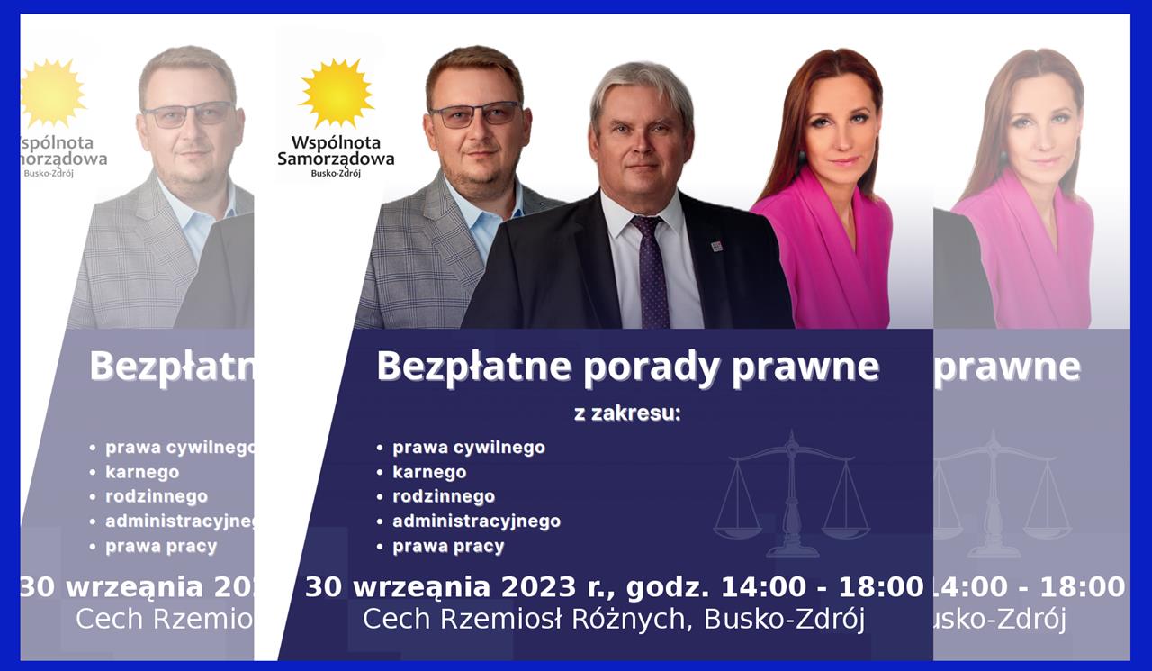 Radny sejmiku wojewódzkiego, Maciej Gawin wraz z Wspólnotą Samorządową organizuje kolejne bezpłatne porady prawne dla mieszkańców powiatu buskiego. Konsultacje będą udzielane w dniu 30.09.2023 r., w godzinach od 14:00 do 18:00, w budynku Cechu Rzemiosł przy ul. Partyzantów 22, 28-100 Busko-Zdrój.