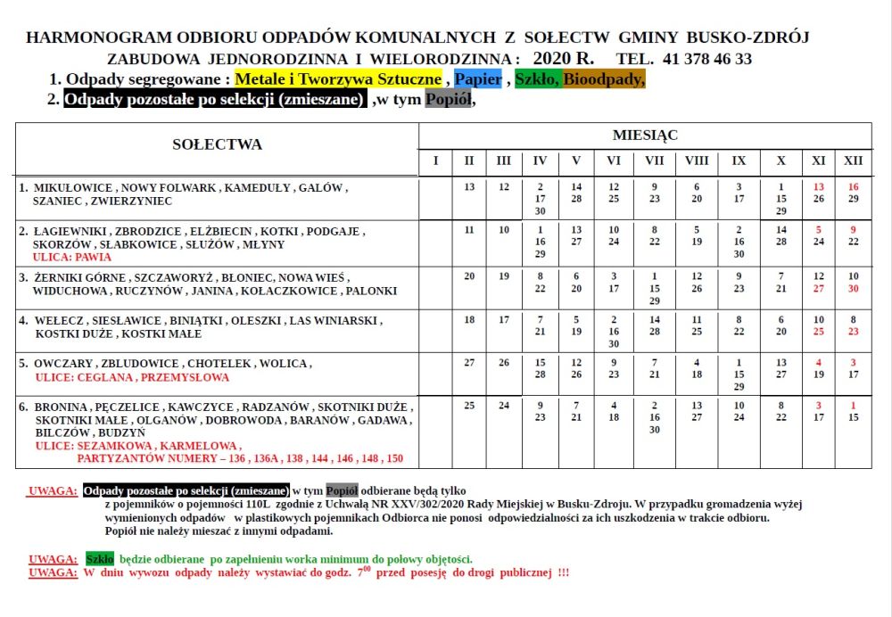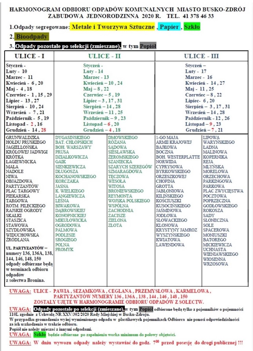 Od 1 listopada 2020r. zwiększeniu ulega częstotliwość odbioru odpadów komunalnych na terenie Gminy Busko-Zdrój. Dodatkowe terminy wywozu odpadów zaznaczone są w harmonogramach na kolor czerwony.