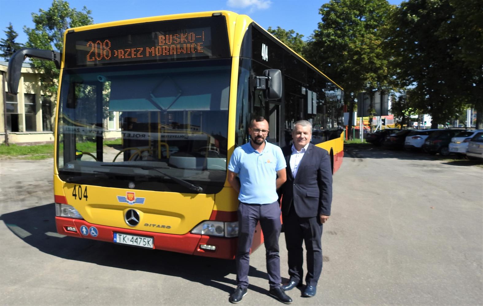 ○ Bogdan Latosiński i kierowca, pan Łukasz przy Mercedesie mającym obsługiwać wydłużoną linię „208” Kielce-Busko, MPK, 9.09.2020 / fot. © Jarosław Kruk; infobusko.pl