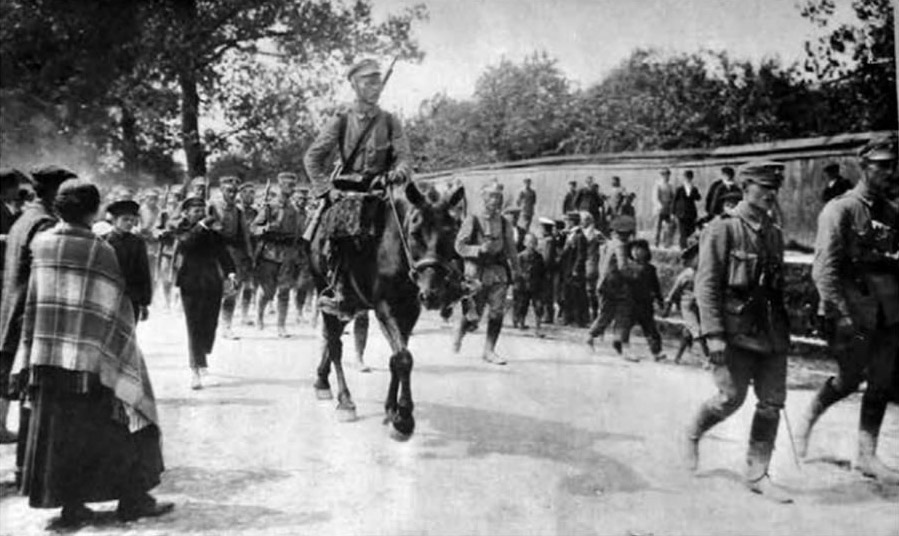○ Dowódca Kazimierz „Herwin” Piątek♂ na czele I Kompanii Kadrowej wkracza do Kielc, 12 sierpnia 1914 r.♂ / źródło: Narodowe Archiwum Cyfrowe♂
