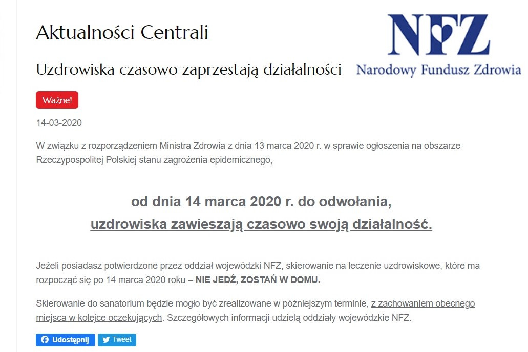 W związku z rozporządzeniem Ministra Zdrowia z dnia 13 marca 2020 r. w sprawie ogłoszenia na obszarze Rzeczypospolitej Polskiej stanu zagrożenia epidemicznego, od dnia 14 marca 2020 r. do odwołania, uzdrowiska zawieszają czasowo swoją działalność. – poinformował dziś na swojej e-stronie Narodowy Fundusz Zdrowia