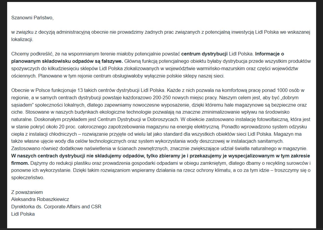Oprócz zagrożeń dla środowiska, protestujący wskazują też, że… – cały artykuł i stanowisko Lidla w tej sprawie na źródłowej stronie Radio Olsztyn♂