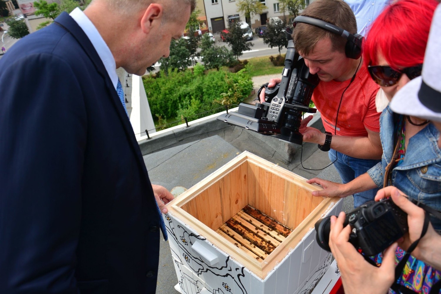 Beata Antoszewska, prezes kieleckiego okręgu Ligi Ochrony Przyrody i prezydent Kielc Bogdan Wenta zaprezentowali miejski ul na dachu Kieleckiego Centrum Kultury. Grafikę na pasiece wykonał kielecki plastyk Michał Lach. / fot. Anna Bilska, Echo Dnia