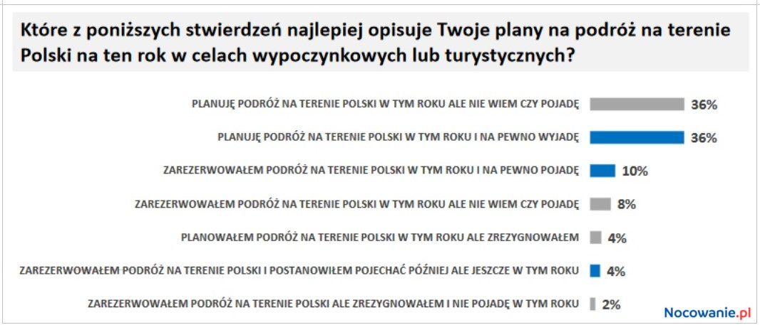 Góry, morze, czy jeziora – wszystko poczeka. A sezon letni, czy nawet jesienny również gwarantuje niesamowite przeżycia i sprzyja naszemu wypoczynkowi. Zdania, co do wyjazdów są podzielone. Dokładnie tyle samo osób (36% w jednym i drugim przypadku) planuje podróż do Polski w tym roku. Jedni są zdecydowani na wyjazd, drudzy z kolei w dalszym ciągu się wahają. Osób, które dokonały już rezerwacji jest zdecydowanie mniej. W pełni zdecydowanych, mających zarezerwowany nocleg jest 10%, natomiast 8% czeka na dalszy rozwój wydarzeń i nie wie, czy pojedzie. Dane te mogą się znacząco zmienić, jeśli sytuacja się poprawi. Osoby planujące wyjazd z pewnością zmienią zdanie, jeśli uda się pokonać coronavirusa. Wówczas, jeśli weźmiemy pod uwagę te wszystkie osoby planujące podróż, otrzymamy bardzo dobry wynik.