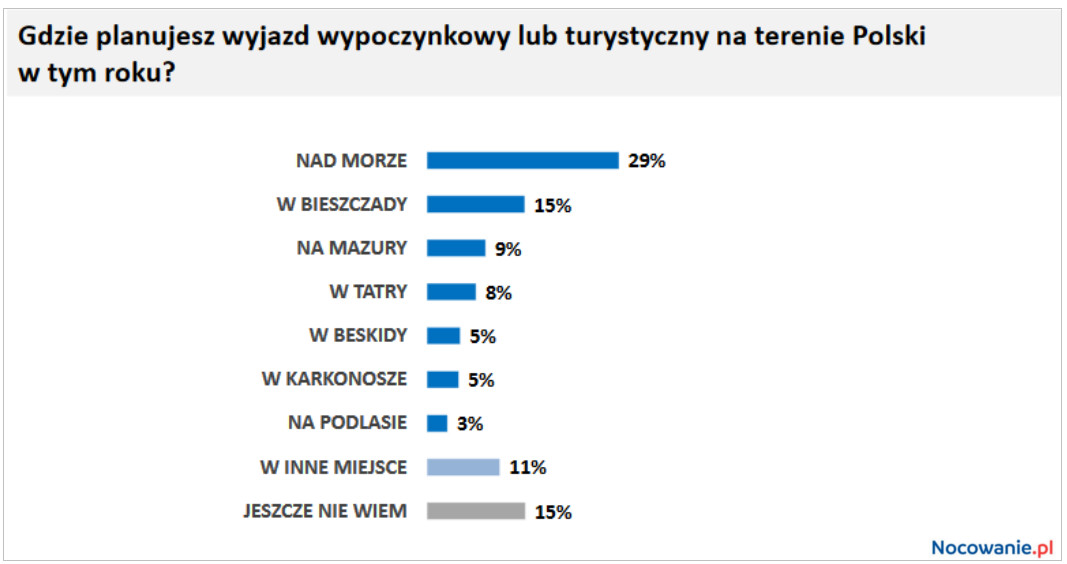Nie będzie zaskoczeniem również fakt, że to góry są głównym celem podróży Polaków, wybierze się tam aż 32% badanych. Nad morze według szacunków wybierze się 29% turystów. Na pozostałych miejscach znajdują się Mazury i Podlasie. 15% osób jest niezdecydowanych, natomiast 11% osób wybiera inne miejsca, ściśle nieokreślone.