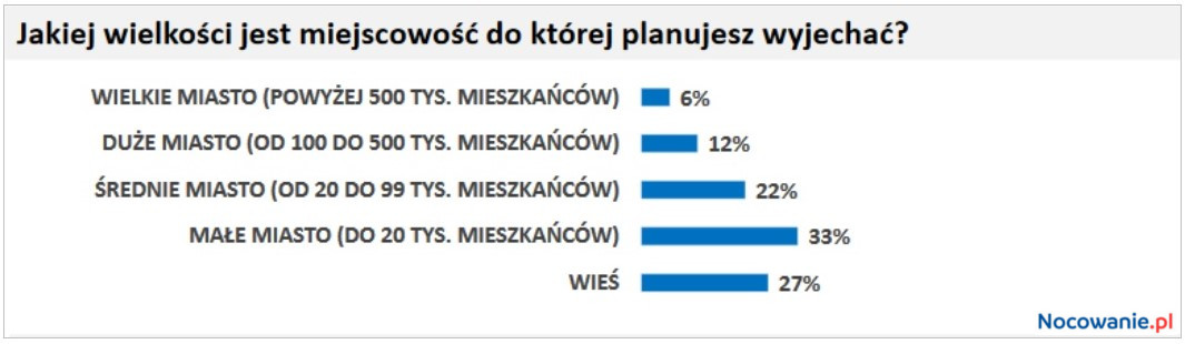 Największą popularnością cieszą się mniejsze miejscowości (do 20 tys. mieszkańców) i wsie, w których każdy zazna ciszy i spokoju. Te kierunki wybiera łącznie 60% turystów. Równie dużym zainteresowaniem cieszą się nieco większe miejscowości (do 99 tys. mieszkańców), na które decyduje się 22% mieszkańców. Wielkie miasta są zazwyczaj wybierane przez niewielką część (6%) turystów.
