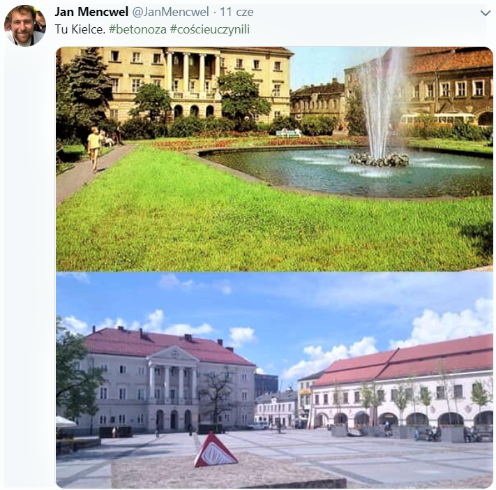 Jan Mencwel twierdzi z kolei, że beton w miastach jest skutkiem połączenia ignorancji urzędników oraz nagłego zastrzyku unijnej gotówki. – Przyszły duże pieniądze z Unii Europejskiej, a brakowało pomysłu, jak je wydać. Najłatwiej było zrobić projekt rewitalizacji rynków za kilka milionów złotych. Problem w tym, że w tych wszystkich miastach i miasteczkach nie było osób, które zasadziłyby tam drzewa. Nastąpiła moda na beton. To chyba nasz polski kompleks, bo wydaje się nam, że beton jest wielkomiejski. To podstawowy brak wyobraźni i wrażliwości. Drzewa są zasobem, a burmistrzowie traktują je jako zło konieczne – twierdzi.