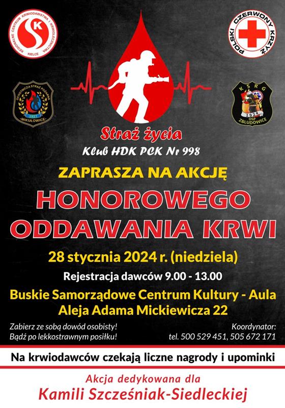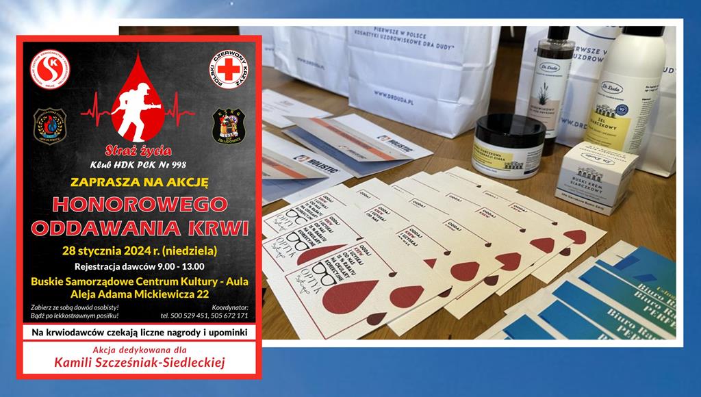 28 stycznia 2024 r. – Klub Honorowych Dawców Krwi PCK „Straż Życia” nr 998 ponownie mobilizuje społeczność na rzecz wartościowego celu: pomoc dla Kamili Szcześniak-Siedleckiej. Przy współpracy z lokalnymi przedsiębiorcami, firmami i stowarzyszeniami organizuje akcję honorowego oddawania krwi, która staje się nie tylko szlachetnym gestem, ale także szansą na zdobycie atrakcyjnych nagród.