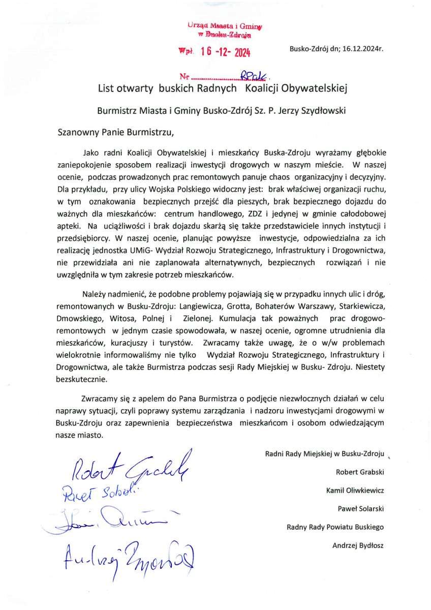 ○ List otwarty buskich Radnych Koalicji Obywatelskiej z 16.12.2024 r. do Burmistrza Miasta i Gminy Busko-Zdrój Pana Jerzego Szydłowskiego