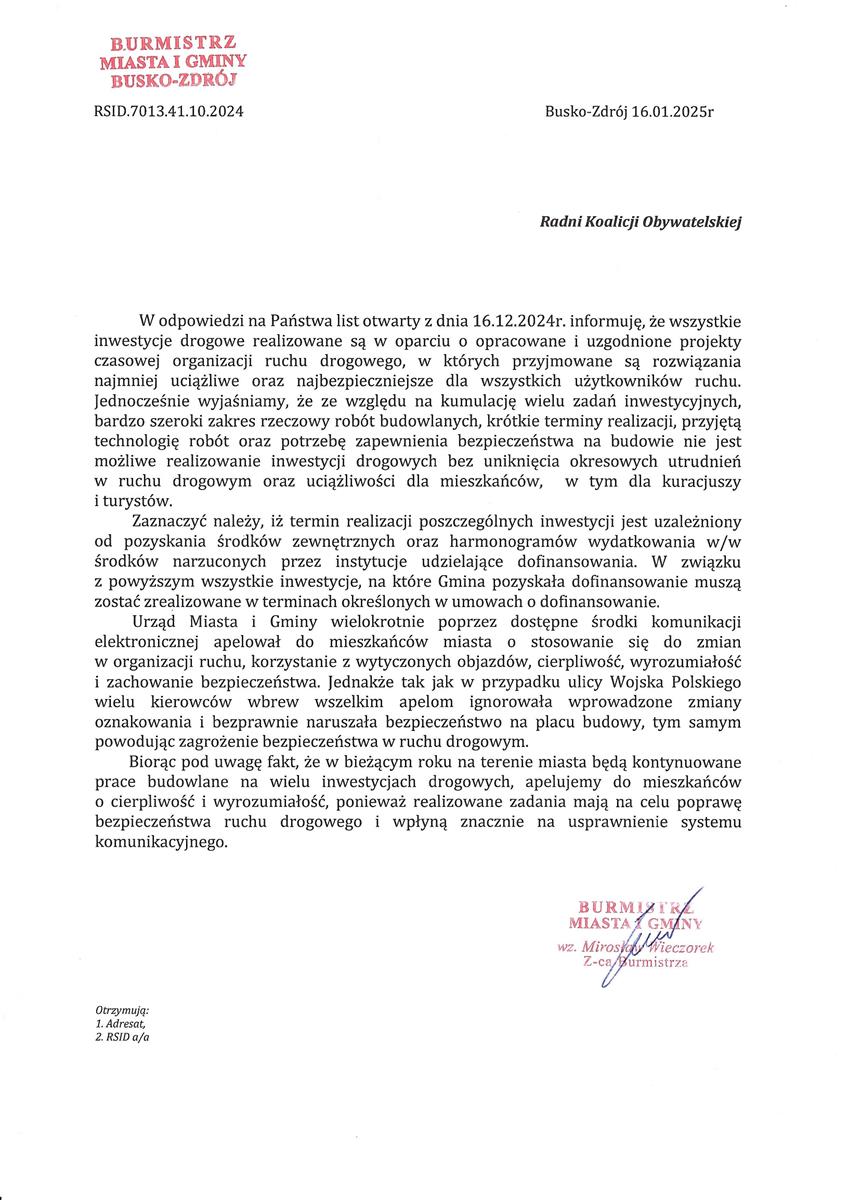 Odpowiedź Burmistrza Buska-Zdroju znak: RSID 7013.41.10.2024 z dnia 16.01.2025 na List otwarty z dnia 16.12.2024 Radnych z Koalicji Obywatelskiej:
