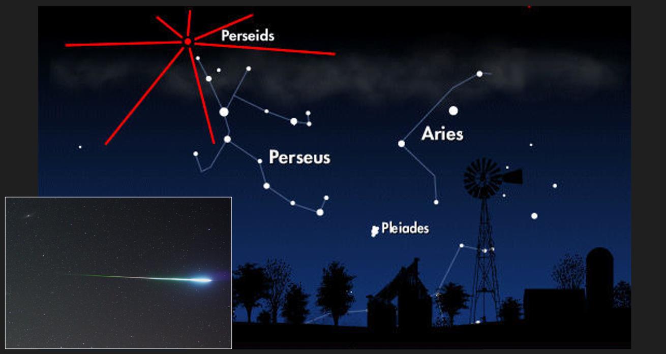 Perseidy nadlatują z okolic gwiazdozbioru Perseusza, aby je zobaczyć patrzymy w kierunku północno-wschodnim. Maksymalne ich natężenie powinno wystąpić za tydzień – noc z 12 na 13 sierpnia. Perseidy są znane jako „łzy świętego Wawrzyńca” (10 sierpnia, to dzień męczeńskiej śmierci tego świętego). Nazwa roju pochodzi od pozornego miejsca, z którego wydają się lecieć meteory. Jest to gwiazda „η Persei” w gwiazdozbiorze Perseusza.