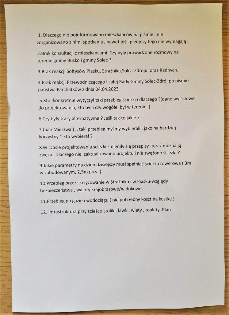 Blisko 50 osób przyszło 9 maja 2023 r., we wtorek, na 10:00, do świetlicy wiejskiej w Piasku Małym na zebranie zorganizowanym z inicjatywy radnego Rady Gminy Solec-Zdrój♂ Eryka Grabowskiego’, by wyrazić swoje głębokie niezadowolenie z zaprojektowanej trasy przebiegu ścieżki rowerowej mającej powstać między Buskiem a Solcem, do której budowy zamierza niedługo przystąpić Gmina Solec-Zdrój. Sprzeciw właścicieli gruntów wzbudza również zbyt duża ich zdaniem szerokość pasa terenu przejmowanego pod tę realizację, zakres prac oraz niewłaściwy w ich ocenie sposób informowania o inwestycji i jej konsultowania z właścicielami gruntów przez które ją poprowadzono.