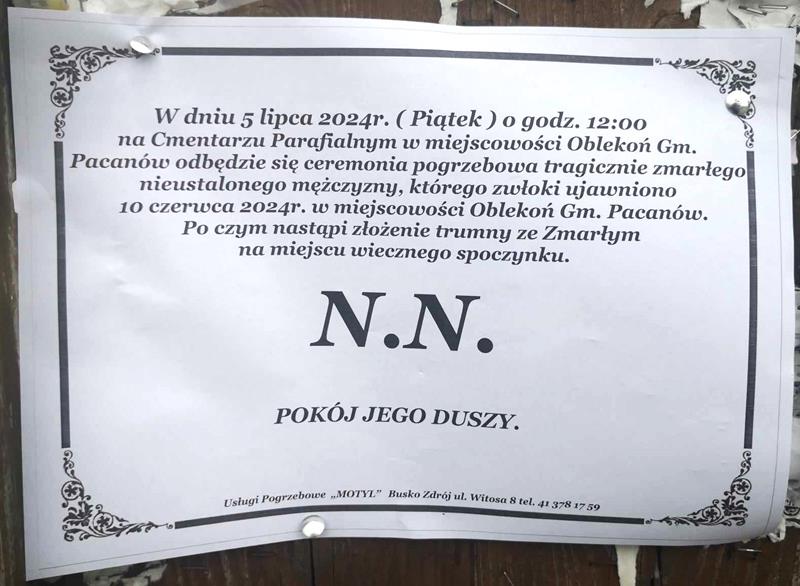 10 czerwca bieżącego roku w miejscowości Oblekoń w powiecie buskim, przy drodze w pobliżu cmentarza i wału wiślanego ujawniono ciało mężczyzny. Już ze wstępnych ustaleń wynikało, że do jego śmierci mógł się ktoś przyczynić. Jednak ze względu na obrażenia trudno było ustalić jak wyglądał i kim był mężczyzna. Na miejscu pojawili się policyjni technicy, którzy bardzo starannie, centymetr po centymetrze zbadali miejsce zdarzenia i zabezpieczyli ślady. Ciało mężczyzny zostało zabezpieczone w prosektorium i poddane szczegółowym badaniom przez biegłych patomorfologów.Do sprawy włączyli się policyjni specjaliści z Centralnego Laboratorium Kryminalistycznego Policji, którzy odtworzyli przybliżony portret mężczyzny. Dodatkowo funkcjonariusze przygotowali różne warianty jego wizerunku z uwzględnieniem różnego wieku oraz koloru tęczówki. Wizerunek został opublikowany w mediach.