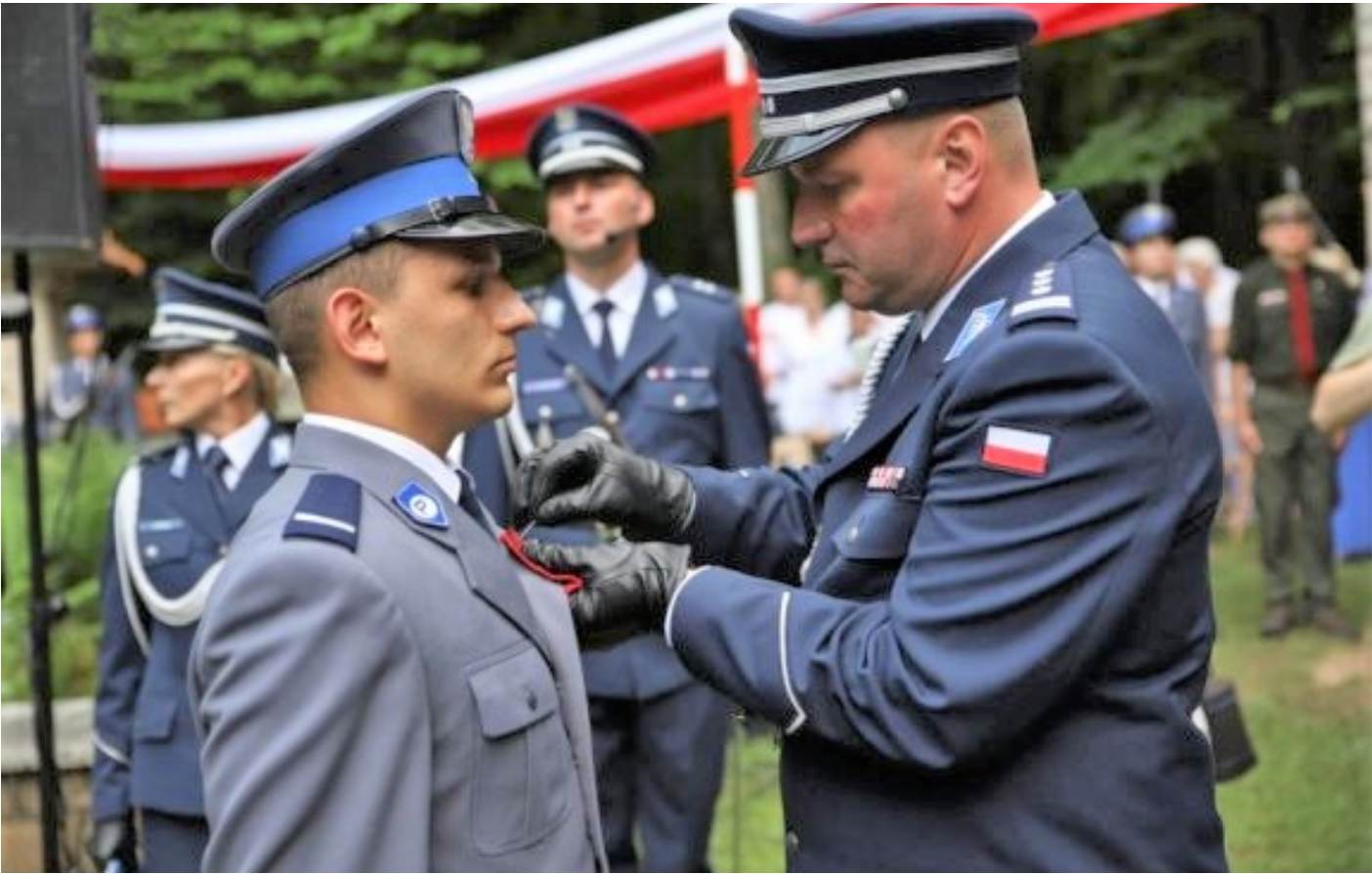 Starszego posterunkowego Łukasza Czaję z Buska odznacza komendant wojewódzki świętokrzyskiej policji inspektor Paweł Dzierżak / źródło: swietokrzyska.policja.gov.pl