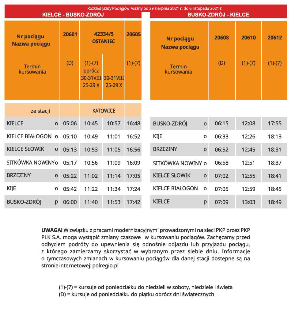 ○ Od 29 sierpnia 2021r. r. obowiązuje nowy rozkład jazdy pociągów PKP na trasie Busko-Zdrój – Kielce / duży rozmiar po kliknięciu na grafikę