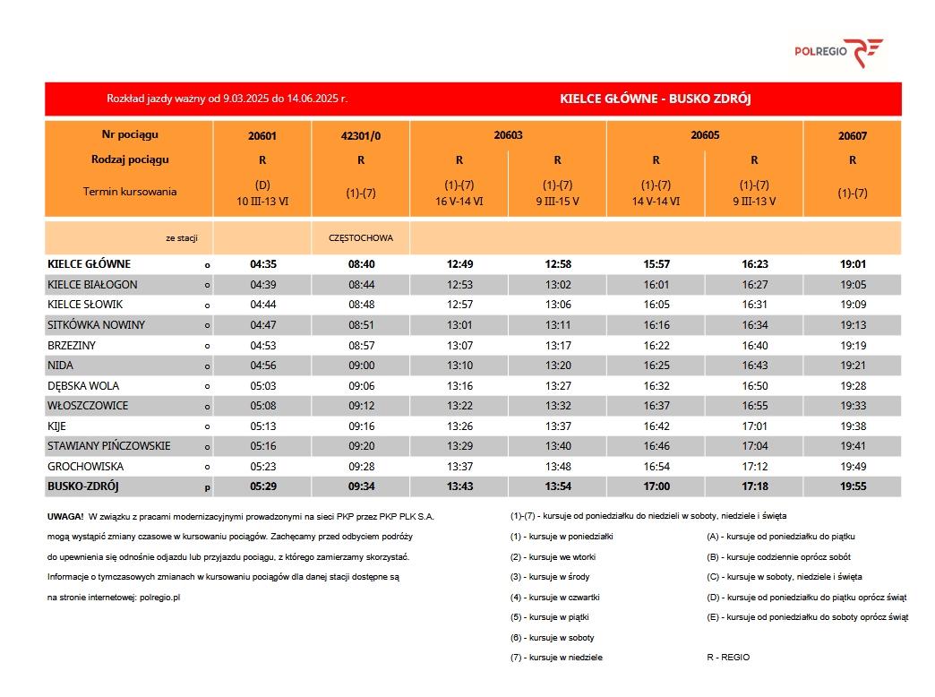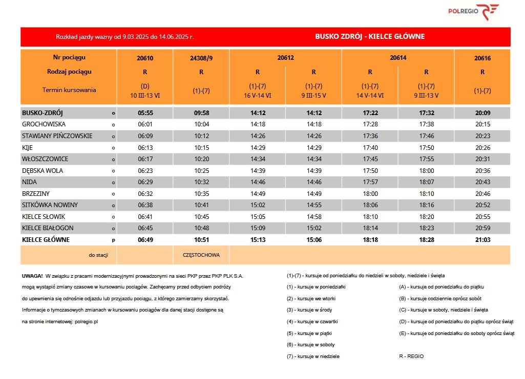 Rozkład jazdy Kielce – Busko-Zdrój  ważny od 9 marca 2025r. do 14.06.2025r.  (PDF♂