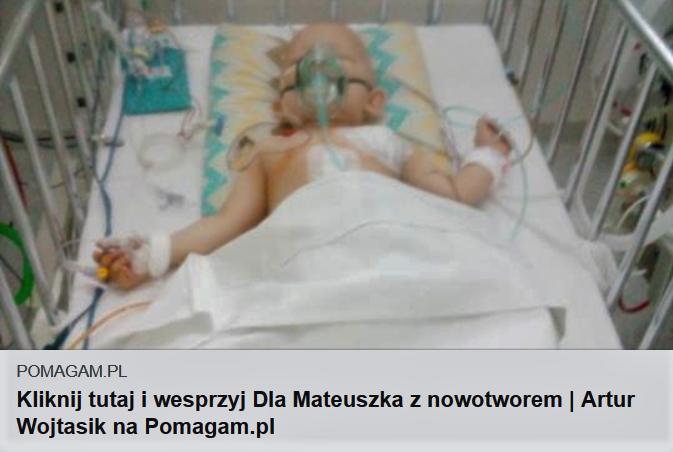 „Dzień dobry mam na imię Artur. Wraz z żoną Izą trafiliśmy do Centrum Zdrowia Dziecka w Warszawie gdzie leczymy 14 miesięcznego syna Mateusza,który ma nowotwór wątroby tzw.,,hepatoblastoma,,. Jesteśmy w 2.gim cyklu chemii. Zbieramy na dalszy pobyt w szpitalu, m.in. na pampersy, mleko, ogólnie środki ułatwiające nasz pobyt w szpitalu. Bardzo prosimy o wsparcie bo przed nami bardzo długie leczenie. Żona i ja jesteśmy cały czas przy synu, ja musiałem zrezygnować z pracy. Z niecierpliwością oczekujemy na każdą wiadomość o jego stanie zdrowia i czy będzie operacja czy przeszczep. Za każdą złotówkę dziękujemy z całego serca”