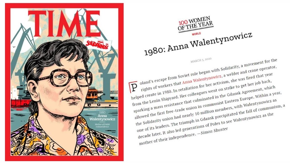 Działaczka wolnych związków zawodowych i legenda „Solidarności” Anna Walentynowicz została uznana przez amerykański tygodnik „Time” za jedną ze 100 kobiet, które zdefiniowały ostatnie stulecie. Walentynowicz, która zginęła w katastrofie smoleńskiej, wskazano jako najważniejszą kobietę 1980 roku. – informuje portal PolskieRadio24.pl i zachęca: – Zobacz serwis specjalny