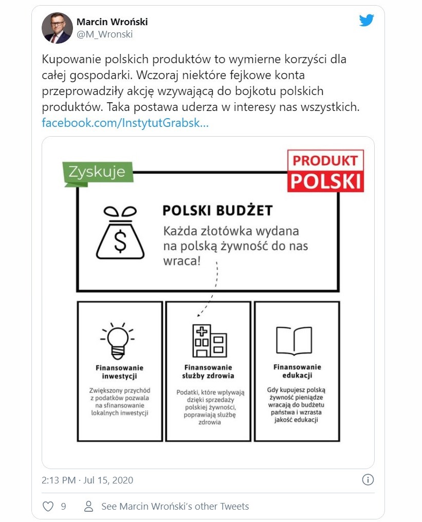 – Miarą patriotyzmu jest kupowanie towarów pochodzących od krajowych producentów. Tak robią inne kraje i tak coraz częściej postępują Polacy – powiedział Marcin Wroński z Krajowego Ośrodka Wpierania Rolnictwa w audycji „Ekspres Gospodarczy” w Programie 1 Polskiego Radia. – informuje portal PolskieRadio24.pl