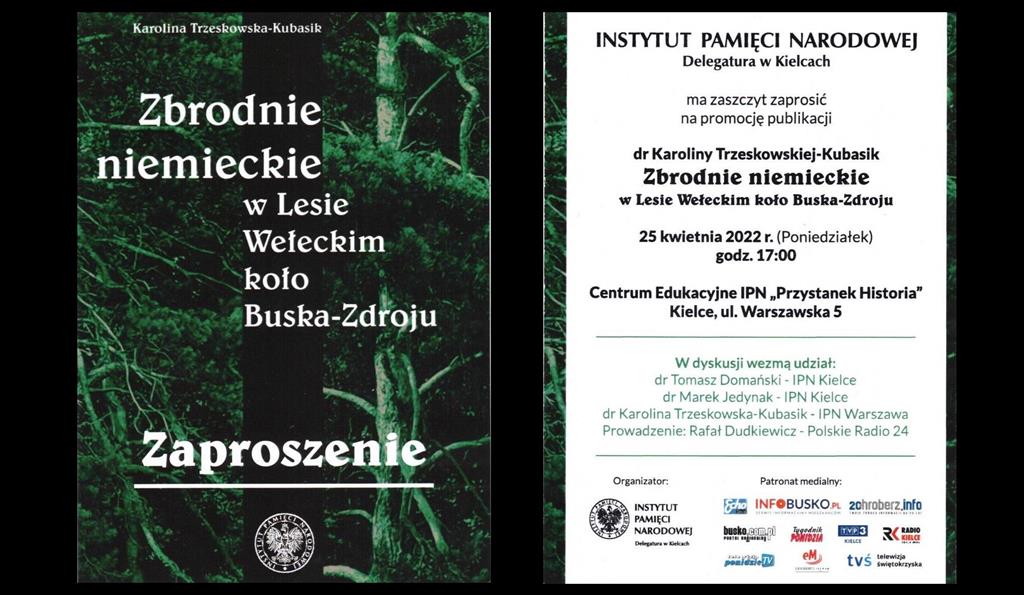 W poniedziałek, 25 kwietnia o godz. 17:00 w Kielcach, w Centrum Edukacyjnym IPN ” Przystanek Historia” przy ul. Warszawskiej 5♂,  odbędzie się promocja najnowszego dzieła pani dr Karoliny Trzeskowskiej – książki „Zbrodnie niemieckie w Lesie Wełeckim koło Buska-Zdroju”. Publikacja powstała w ramach projektu IPN pt. „Terror okupacyjny na ziemiach polskich w latach 1939-1945”, ukazała się nakładem Wydawnictwa Instytutu Pamięci Narodowej.