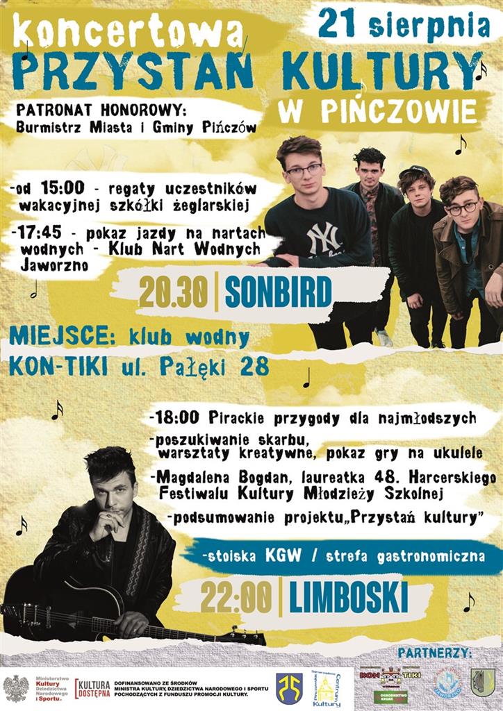 Około 20:00, wspólnie z partnerami, podsumujemy dotychczasowe działania w ramach projektu „Przystań kultury” i wręczymy nagrody zwycięzcom regat. Od 20:30 oddajemy scenę muzyce i zanurzamy się pięknych dźwiękach a te serwować nam będą fantastyczne zespoły: SONBIRD i LIMBOSKI. Oba zespoły wyróżnia niepowtarzalny styl i brzmienie. Zespół SONBIRD tworzy czterech młodych chłopaków z Żywca grających współczesnego indierocka z nieczęsto spotykanym zaangażowaniem. Dotychczasowy dorobek Sonbird sprowadza się do szybko zapracowanej opinii świetnego zespołu koncertowego, o czym można było przekonać się na największych festiwalach (zagrali między innymi podczas OFF Festival, Open’er Festival, Kraków Live Festival, Hej Fest, Rock In Summer Festival, Męskie Granie, Edison Festival, Białystok New Pop Festival). Często porównywani do Myslovitz czy Kings of Leon.