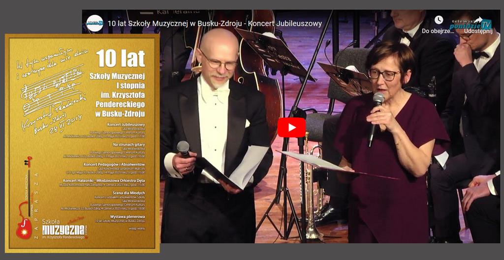 Koncert jubileuszowy w Buskim Samorządowym Centrum Kultury’ zainaugurował świętowanie dziesięciolecia istnienia Szkoły Muzycznej I stopnia im. Krzysztofa Pendereckiego w Busku-Zdroju’. – informuje 10.05.2023 portal Radio Kielce