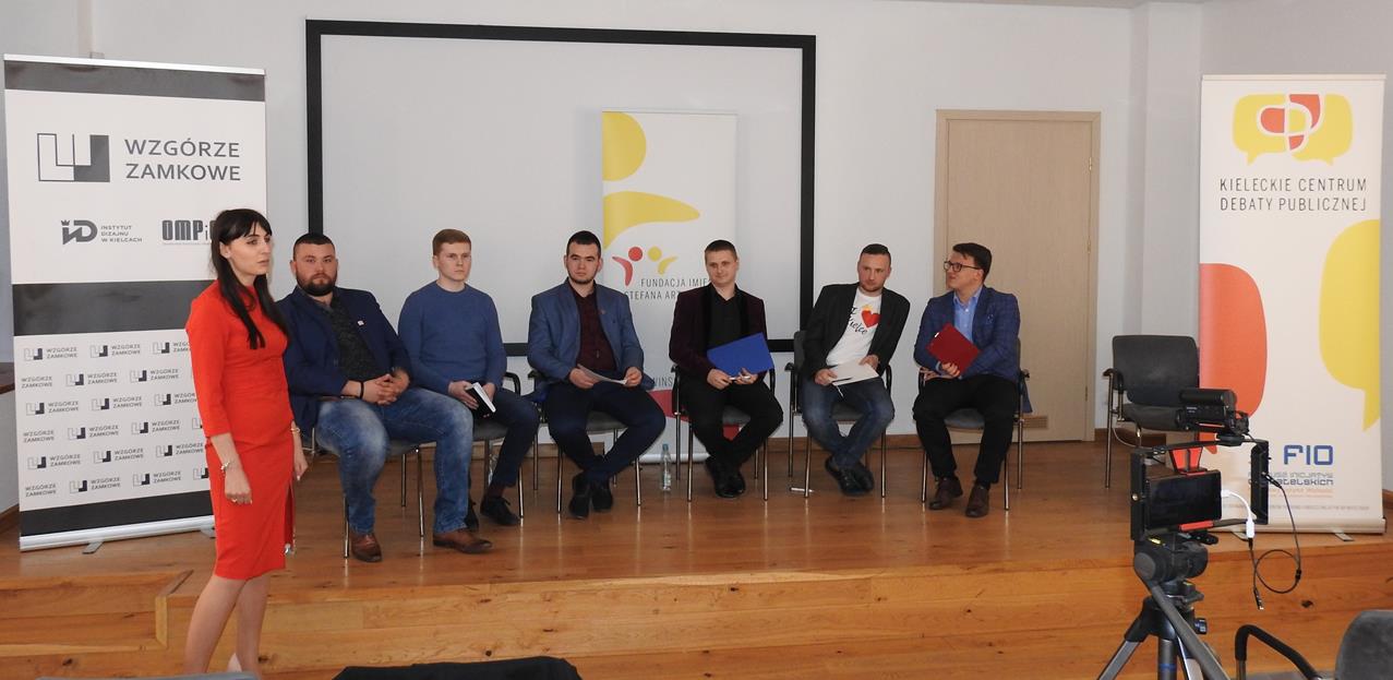 Kielce, OMPiO, Debata młodzieżówek partyjnych. Na zdjęciu od lewej: Maja Wanat – Fundacja im. Stefana Artwińskiego, Sławomir Lech – Konfederacja, Łukasz Wasilewski – Klub Młodych Kukiz’15, Marcin Woch – Młoda Prawica, Grzegorz Prokop – Forum Młodych PiS, Michał Piasecki – Młodzi Demokraci, Paweł Kwietniewski – prowadzący debatę – Fundacja im. Stefana Artwińskiego.