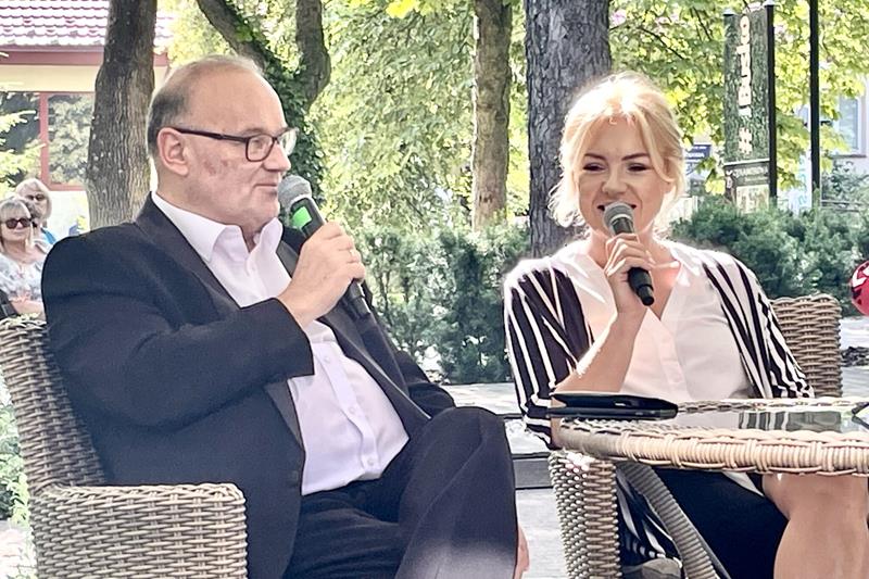 ○ 04.07.2023. Busko-Zdrój. Kawiarenka festiwalowa. Na zdjęciu (od lewej); Artur Jaroń – dyrektor artystyczny Festiwalu im. Krystyny Jamroz, Joanna Nawrot – sopranistka. / Fot. Dorota Klusek – Radio Kielce♂