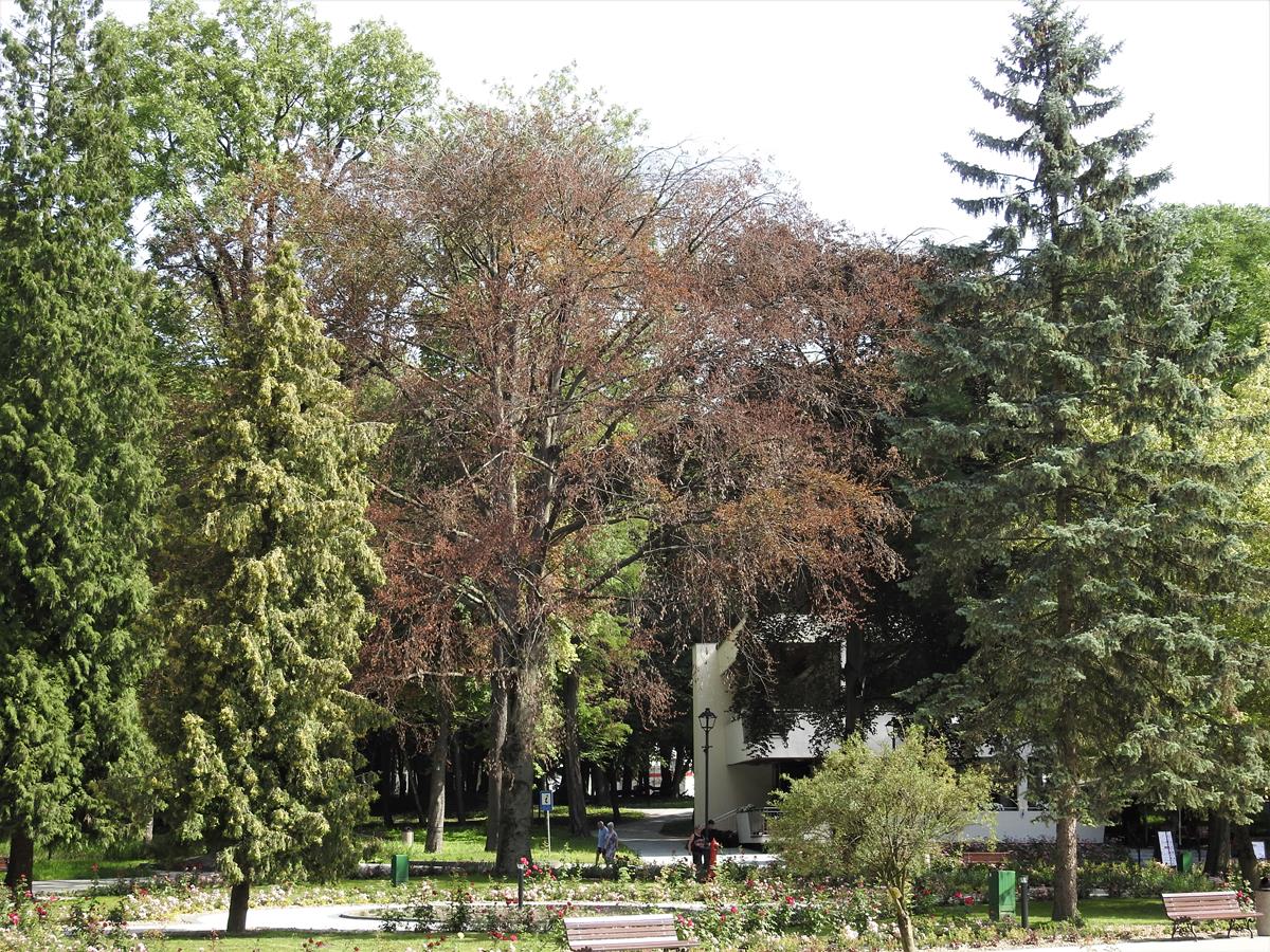 ▲Busko-Zdrój, 13.08.2021: W Parku Zdrojowym, który władze samorządowe ostatnio zrewitalizowały kosztem 18 milionów złotych♂, zaczynają usychać dorodne, stare zabytkowe drzewa… Czy „zrewitalizowane” blisko 200 letnie dzieło architekta Marconiego i ogrodnika Hanusza podzieli los „zrewitalizowanego” Małpiaka i Lasku przy Topolowej? ♂ / fot. Jarosław Kruk