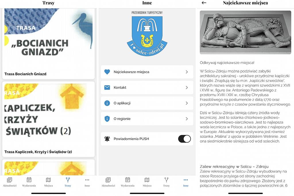Oprócz podstawowej funkcji mobilnego przewodnika turystycznego, aplikacja pełni też rolę informatora. Za pośrednictwem telefonu można na bieżąco śledzić ofertę wydarzeń organizowanych na terenie gminy m.in. koncerty czy aktualny repertuar kina. Można się też dowiedzieć, że do ok. godziny 11:00 dnia 5.10.2021 r. wystąpi przerwa w dostawie wody w kilku miejscowościach, czy o tym, że Gminny Ośrodek Pomocy Społecznej w Solcu od 4.10.2021 rozpoczyna wydawanie skierowań na artykuły żywnościowe.