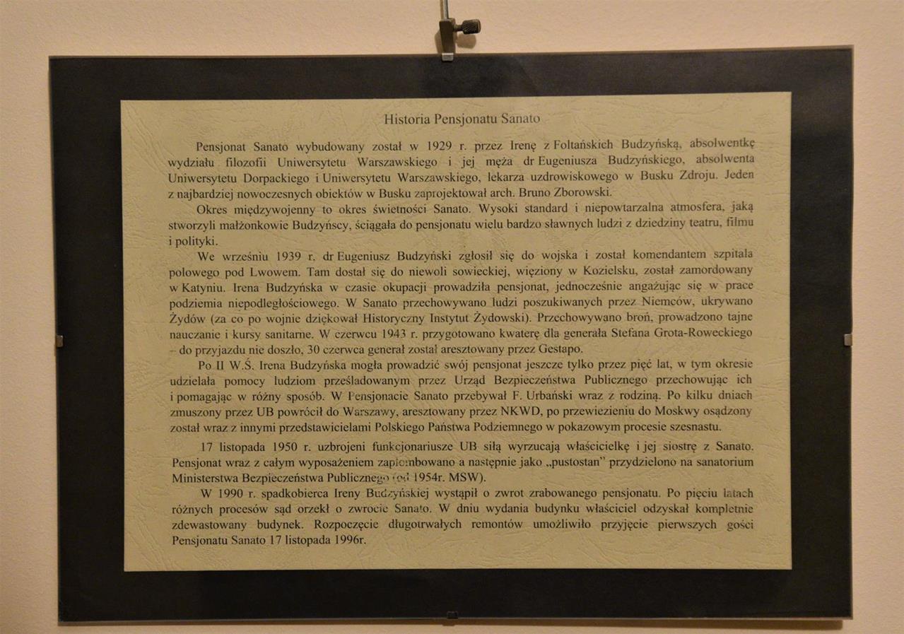 Pensjonat „Sanato”’ mieszczący się w Busku-Zdroju przy ul. 1 Maja 29′ wybudowany został niemal 100 lat temu, w 1929 r., przez ówczesnego lekarza uzdrowiskowego dr Eugeniusza Budzyńskiego’ i jego żonę Irenę z Foltańskich Budzyńską. Zaprojektowany przez architekta Bruno Zborowskiego był w owym czasie jednym z najbardziej nowoczesnych obiektów w Busku.