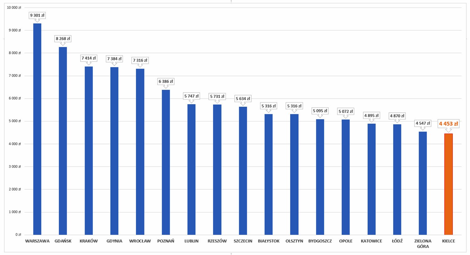 Jak informuje NBP w czwartym kwartale ubiegłego roku transakcyjna cena za 1 m kw. mieszkania na rynku wtórnym wyniosła: w Białymstoku – 5 tys. 316 zł, w Bydgoszczy – 5 tys. 95 zł, w Gdańsku – 8 tys. 268 zł, w Gdyni – 7 tys. 384 zł, w Katowicach – 4 tys. 895 zł, w Krakowie 7 tys. 414 zł, w Lublinie – 5 tys. 747 zł, w Łodzi 4 tys. 870 zł, w Olsztynie – 5 tys. 316 zł, w Opolu 5 tys. 72 zł, w Poznaniu – 6 tys. 386 zł, w Rzeszowie – 5 tys. 731 zł, w Szczecinie – 5 tys. 634 zł, we Wrocławiu – 7 tys. 316 zł, a w Zielonej Górze – 4 tys. 547 zł.