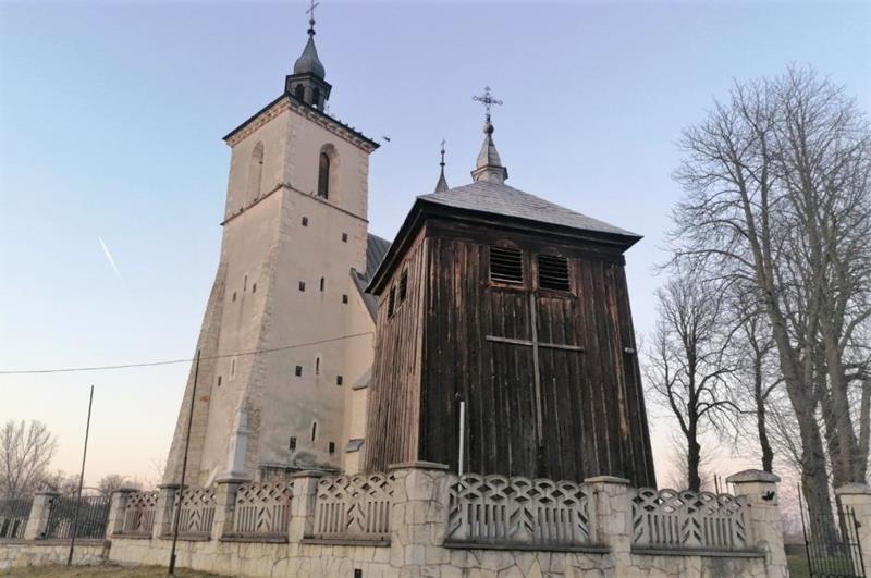 Wzniesiona z kamiennych ciosów świątynia pw. Wniebowzięcia Najświętszej Marii Panny♂ o grubych murach powstała w 1369 roku. Sebastian Motyl z buskiego oddziału Polskiego Towarzystwa Turystyczno – Krajoznawczego♂ mówi, że z dużą dozą prawdopodobieństwa można przyjąć, że wyryte na ścianie świątyni koła z wychodzącymi z ich centralnego punktu promieniami, pochodzą z czasów budowy kościoła.
