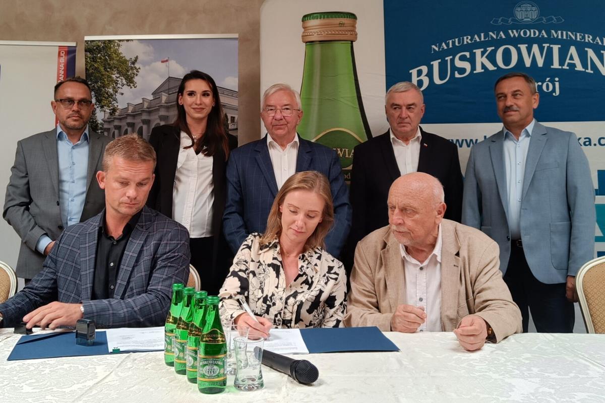07.09.2023. Busko-Zdrój. Popisanie umowy na budowę nowego Zakładu Produkcji Wody Mineralnej „Buskowianka”♂. Na zdjęciu (od lewej w pierwszym rzędzie): Jarosław Ziętal – prezes zarządu firmy budowlanej Anna-Bud’, Magdalena Konieczna-Różycka’ – członek zarządu Uzdrowiska Busko-Zdrój S.A., Stanisław Grzesiak’ – członek zarządu Uzdrowisko Busko-Zdrój S.A. ; ( w drugim rzędzie od lewej); pracownik firmy Anna-Bud, Patrycja Iwańska-Bęben’ – Uzdrowisko Busko-Zdrój S.A., poseł Krzysztof Lipiec, Andrzej Bętkowski – marszałek województwa i Marek Strzała’, wiceprzewodniczący Sejmiku Województwa Świętokrzyskiego, dyrektor buskiego Sanatorium Marconi. / Fot. Ewelina Walczak – Radio Kielce♂