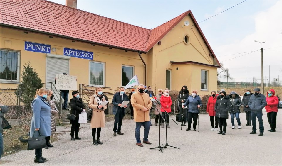 ○ 16.03.2021 Szczaworyż. O 15:30 rozpoczęło się spotkanie z mieszkańcami dotyczące m.in. likwidacji przychodni. Przy mikrofonie radny sejmiku i przewodniczący komisji zdrowia, Maciej Gawin. Tekst na banerze: „WSZYSTKO ZNISZCZYLI, ZOSTAŁ SKLEP MONOPOLOWY” / Fot. Marta Gajda / Radio Kielce♂
