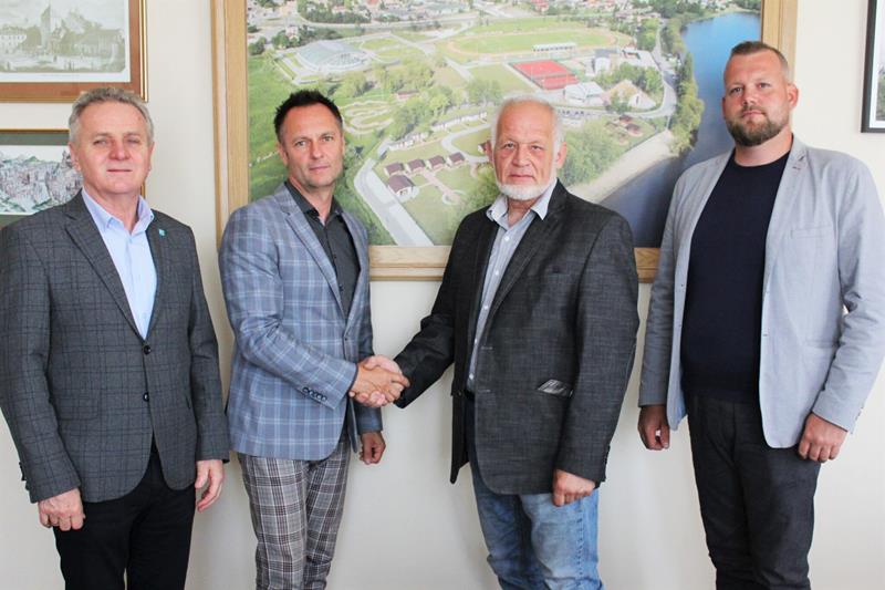 ○ 29.06.2023. Pińczów. Podpisanie umowy na budowę nowego ośrodka zdrowia. Na zdjęciu (od lewej): Włodzimierz Badurak – burmistrz Pińczowa, Marcin Wojniak – dyrektor Samorządowego Zakładu Opieki Zdrowotnej w Pińczowie, Michał Koszka – właściciel buskiej firmy budowlanej, która wygrała przetarg na realizację zadania i Kamil Koszka z tej samej firmy. / Fot. Marta Gajda-Kruk – Radio Kielce.