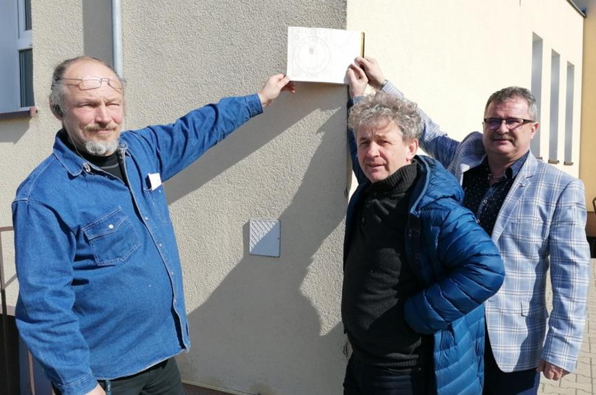 ○ 25.03.2022. Wiślica. Zegar słoneczny ma być umieszczony na narożniku budynku szkoły. Na zdjęciu (od lewej): Jarosław Kruk, Edmund Juszczyk – rzeźbiarz, Artur Haruza – dyrektor szkoły. / Fot. Marta Gajda-Kruk / Radio Kielce