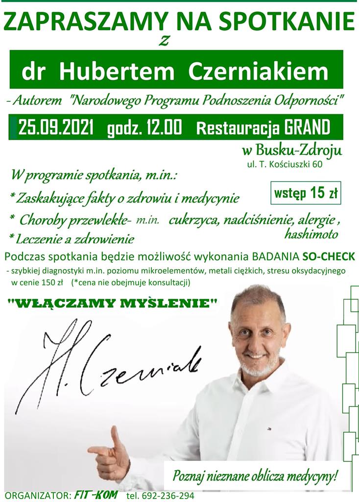 W dniu 25 września w Busku-Zdroju, w restauracji „Grand” odbędzie się spotkanie z dr Hubertem Czerniakiem, autorem „Narodowego Programu Podnoszenia Odporności”. W programie spotkania przewidzianych jest kilka bloków tematycznych, m.in. Zaskakujące fakty o zdrowiu i medycynie, Leczenie a zdrowienie. Organizatorem jest firma FIT-KOM.