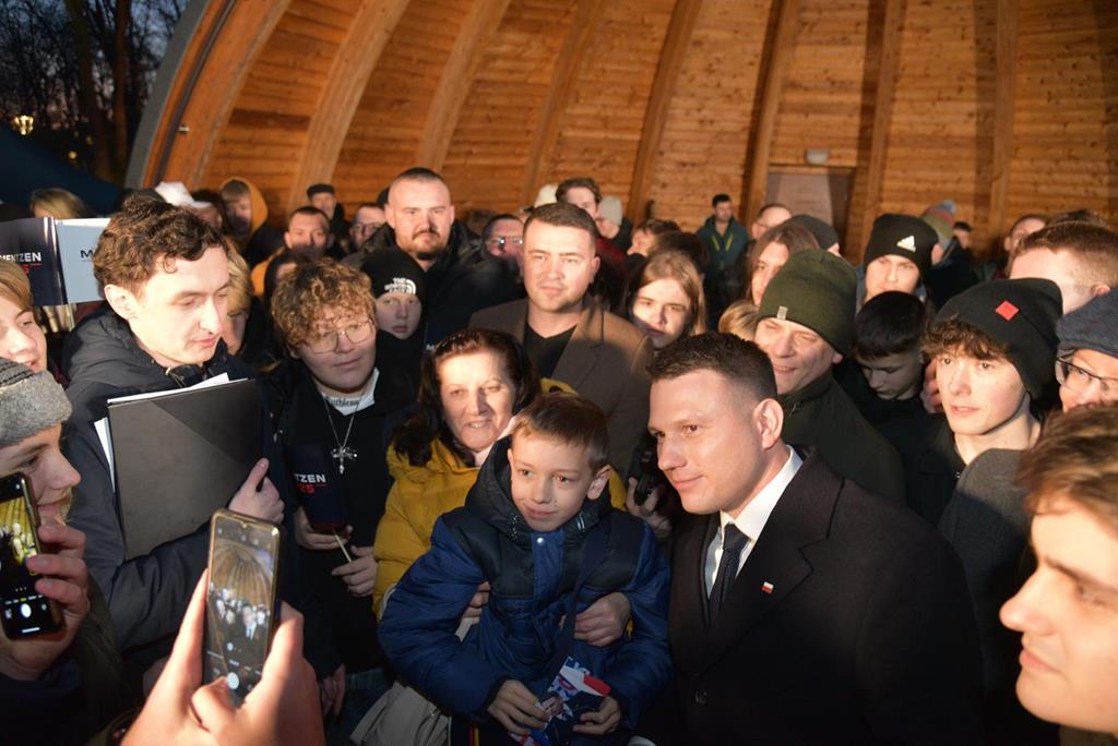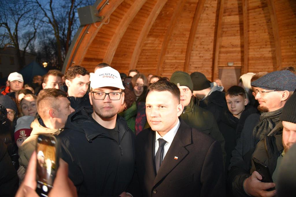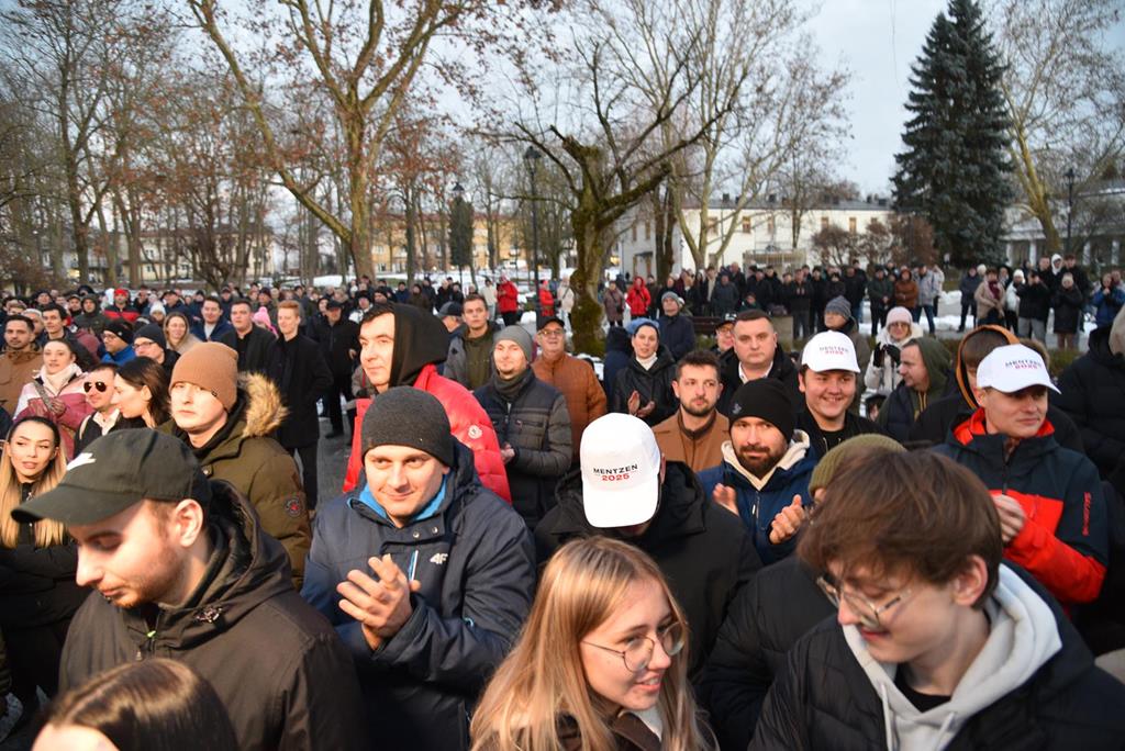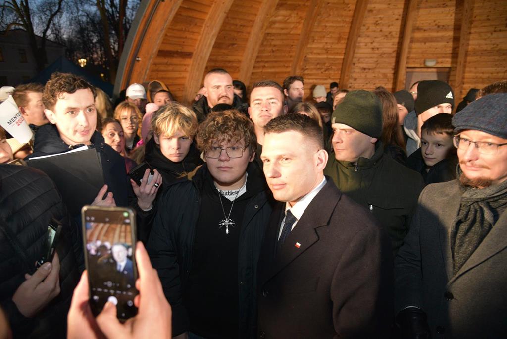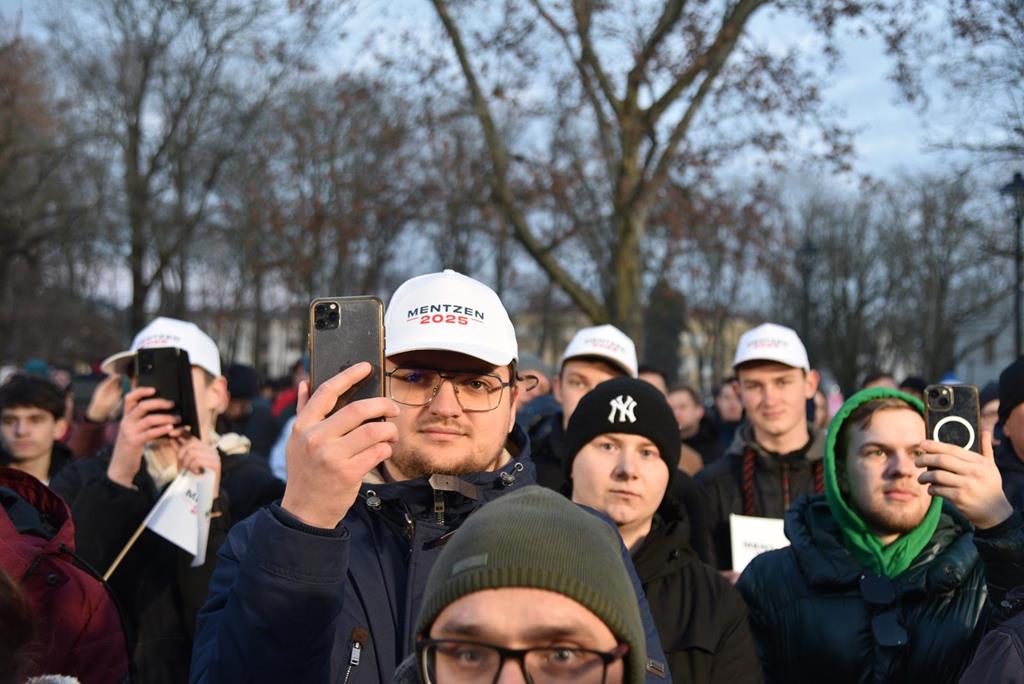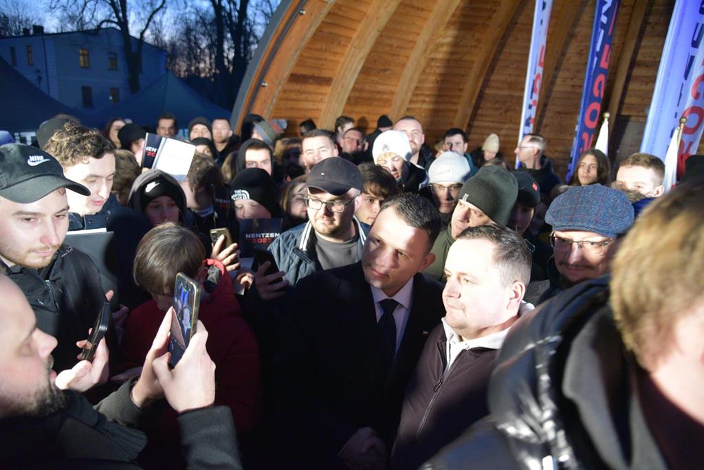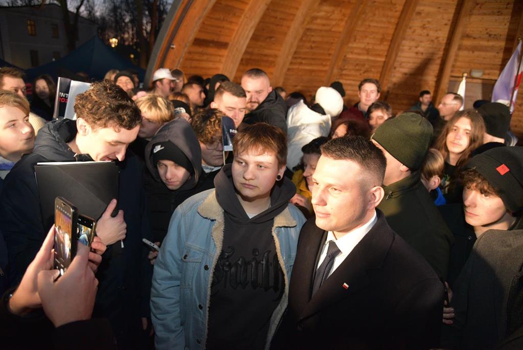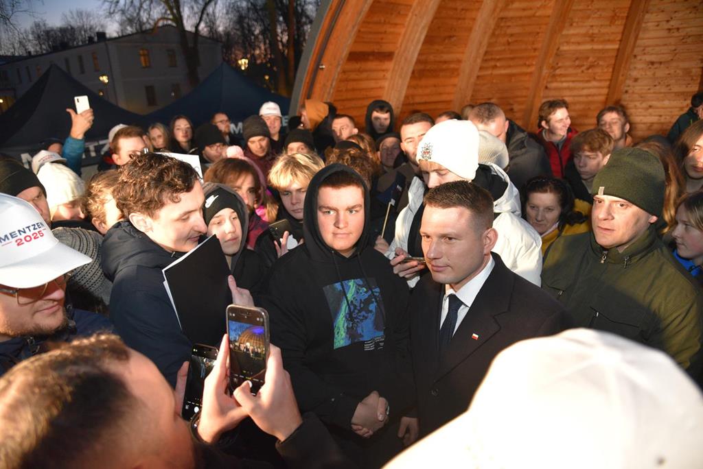Busko-Zdrój, 24.01.2025: Sławomir Mentzen, kandydat Konfederacji na prezydenta Polski spotkał się z wyborcami w Parku Zdrojowym. / fot. infoBusko.pl