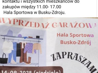 W najbliższą niedzielę, 14 września 2025 r. w Hali Sportowej PMOS przy ul. Kusocińskiego w godzinach od 11:00 do 17:00 odbywać się będzie przygotowana przez Stowarzyszenie Wychowanków 1.LO w Busku-Zdroju Wyprzedaż garażowa. Wydarzeniu towarzyszyć będzie charytatywna zbiórka środków na zakup dla Olka Majchra, niepełnosprawnego chłopczyka, niezbędnego dla funkcjonowania specjalnego wózka. – informuje 9.09.2025 na swoim fb profilu Stowarzyszenie Wychowanków 1.LO w Busku-Zdroju