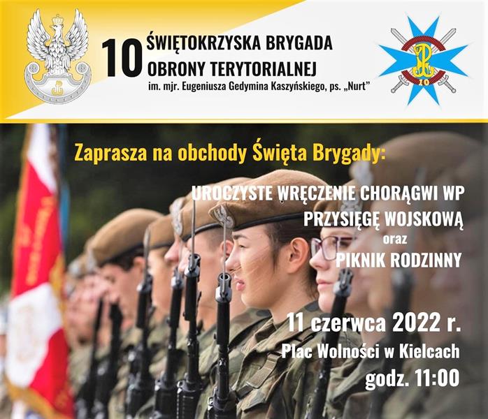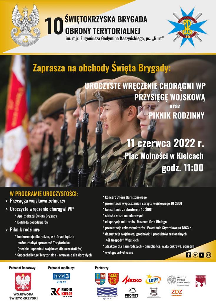 Przysięga wojskowa 50 ochotników, wręczenie chorągwi Wojska Polskiego i rodzinny piknik – tak w punktach będzie wyglądało tegoroczne święto 10 Świętokrzyskiej Brygady Obrony Terytorialnej. Uroczystość rozpocznie się 11 czerwca o godzinie 11:00 na Placu Wolności w Kielcach. Święto brygady patronatem honorowym objął Wojewoda Świętokrzyski Zbigniew Koniusz. – informuje 9.06.2022 Zespół prasowy 10.ŚBOT